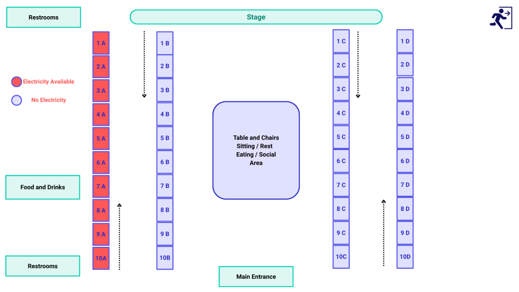 We appreciate your interest in purchasing a table at the 2026 CRHRC Hamfest. There are 40 tables available, 10 in each row labeled rows “A”, “B”, “C” and “D”. Each row contains 10 tables labeled “1A”. “2A, etc. Please refer to the diagram below to select your requested tables. Sold tables will not show in the check-out process.